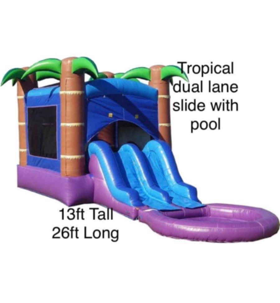 Discover endless fun with our Kids Inflatable Bounce House featuring exciting Water Slides! This bounce house not only includes 2 lanes of thrilling water slides but also comes with a basketball hoop, ensuring hours of entertainment for children. Ideal for sunny days and perfect for parties, it's a favorite among kids of all ages. Designed to be durable and safe, it's also easy to set up, making it the ultimate addition to any backyard or event. Elevate your gatherings with this splash-tastic inflatable attraction! Plus, it comes with dodgeballs for even more fun.