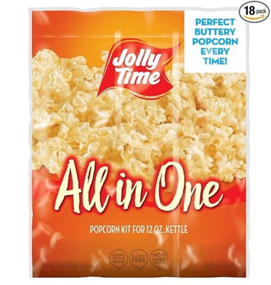 Jolly Time popcorn is made from 100% whole grain, gluten-free, non-GMO yellow corn kernels, complemented by high-quality coconut oil and seasoning salt. Enjoy a delicious and wholesome snack with every kit you use.